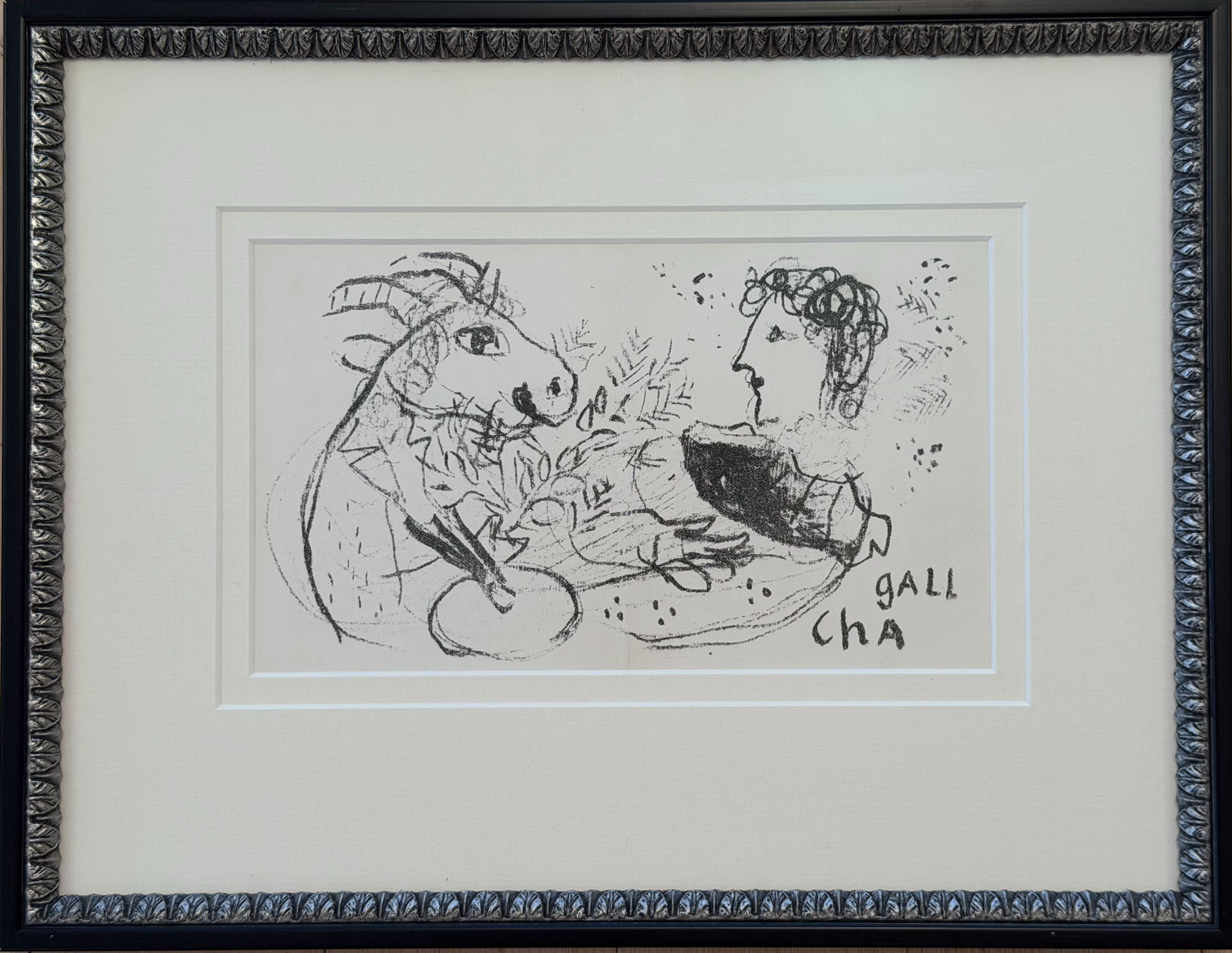 MARC CHAGALL 'CARTE DE VOEUX'(wenskaart) Litho 1966 op Velin papier Oplage 250 Gesigneerd door Mw. Vava Chagall. Afmeting papier 24 x 14,5 cm. Ameting Lijst: 38 x 30 cm. Literatuur: Hatje no. 469