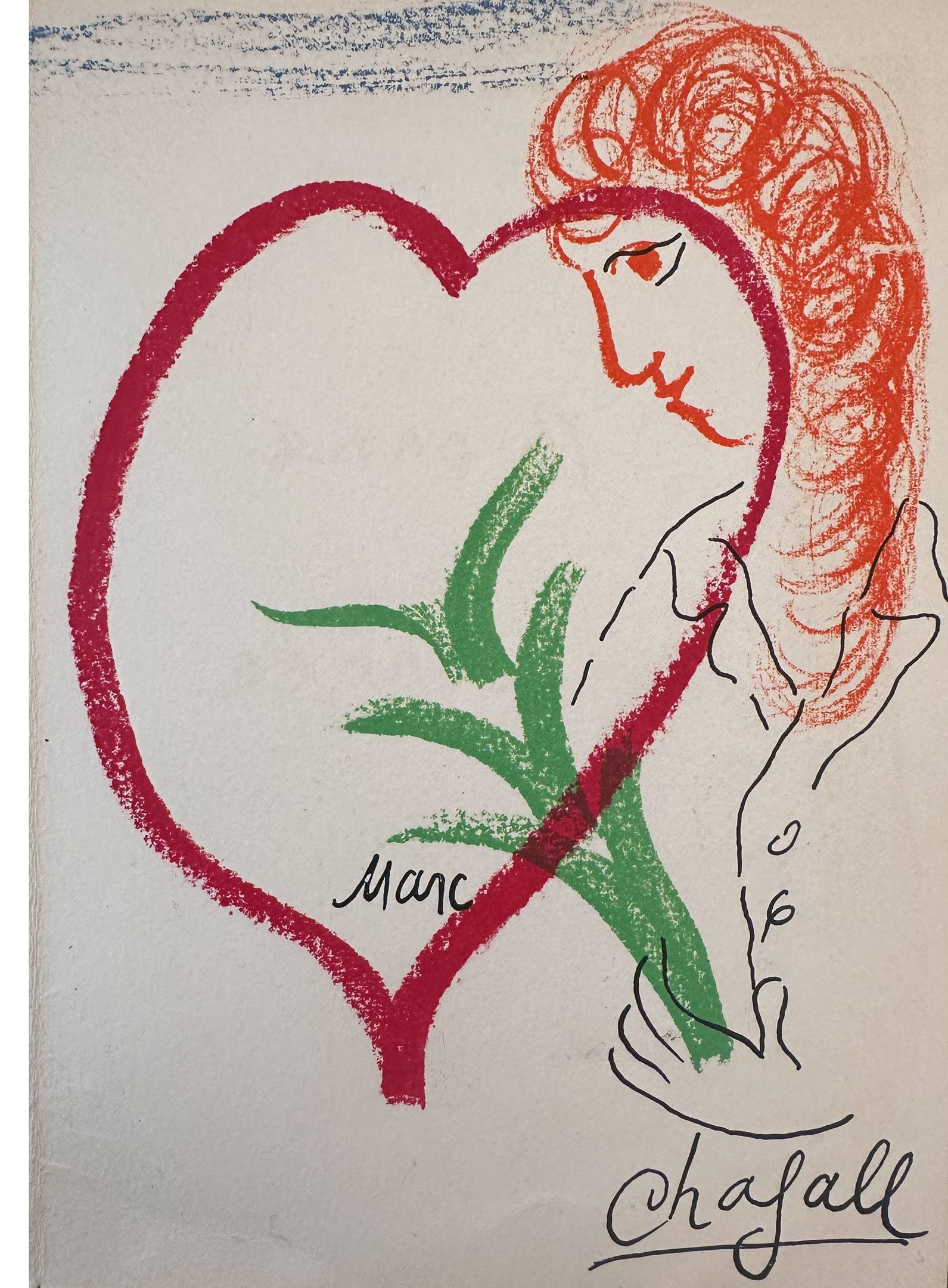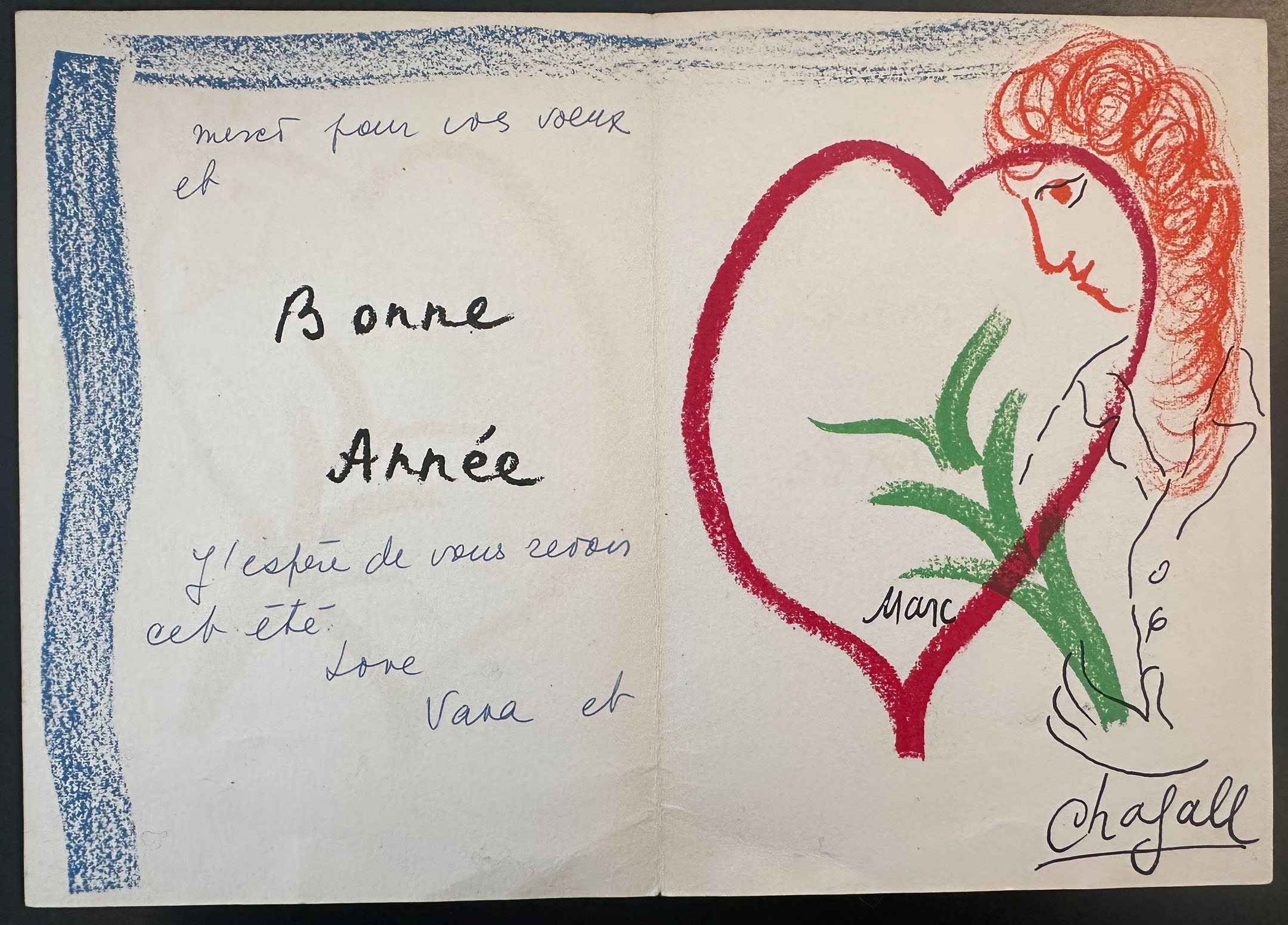 MARC CHAGALL 'CARTE DE VOEUX'(wenskaart) Litho op Velin papier Gesigneerd door Mw. Vava Chagall. Afmeting voorkant kaart 20 x 14 cm.