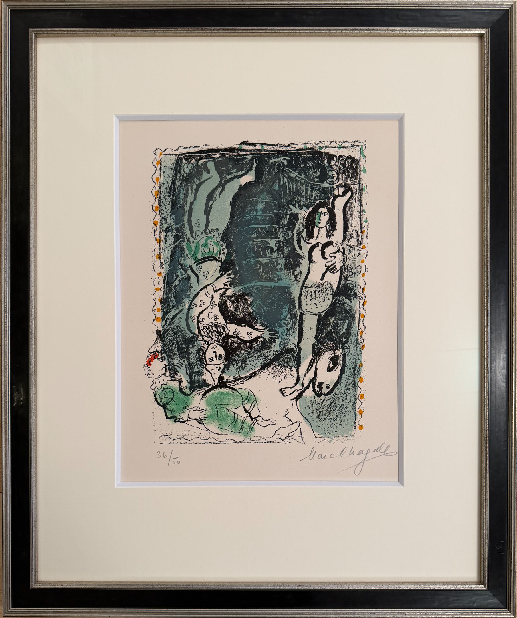 MARC CHAGALL - 'LA PIROUETTE BLEUE' Litho 1966 op Arches papier Oplage 50 exemplaren Met potlood genummerd en gesigneerd Afmeting papier 65 x 47,5 cm. Afmeting lijst: 73 x 61 cm. Geïllustreerd in Hatje, Marc Chagall the Lithographs, no. 471
