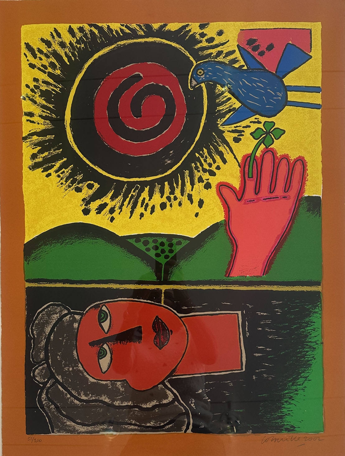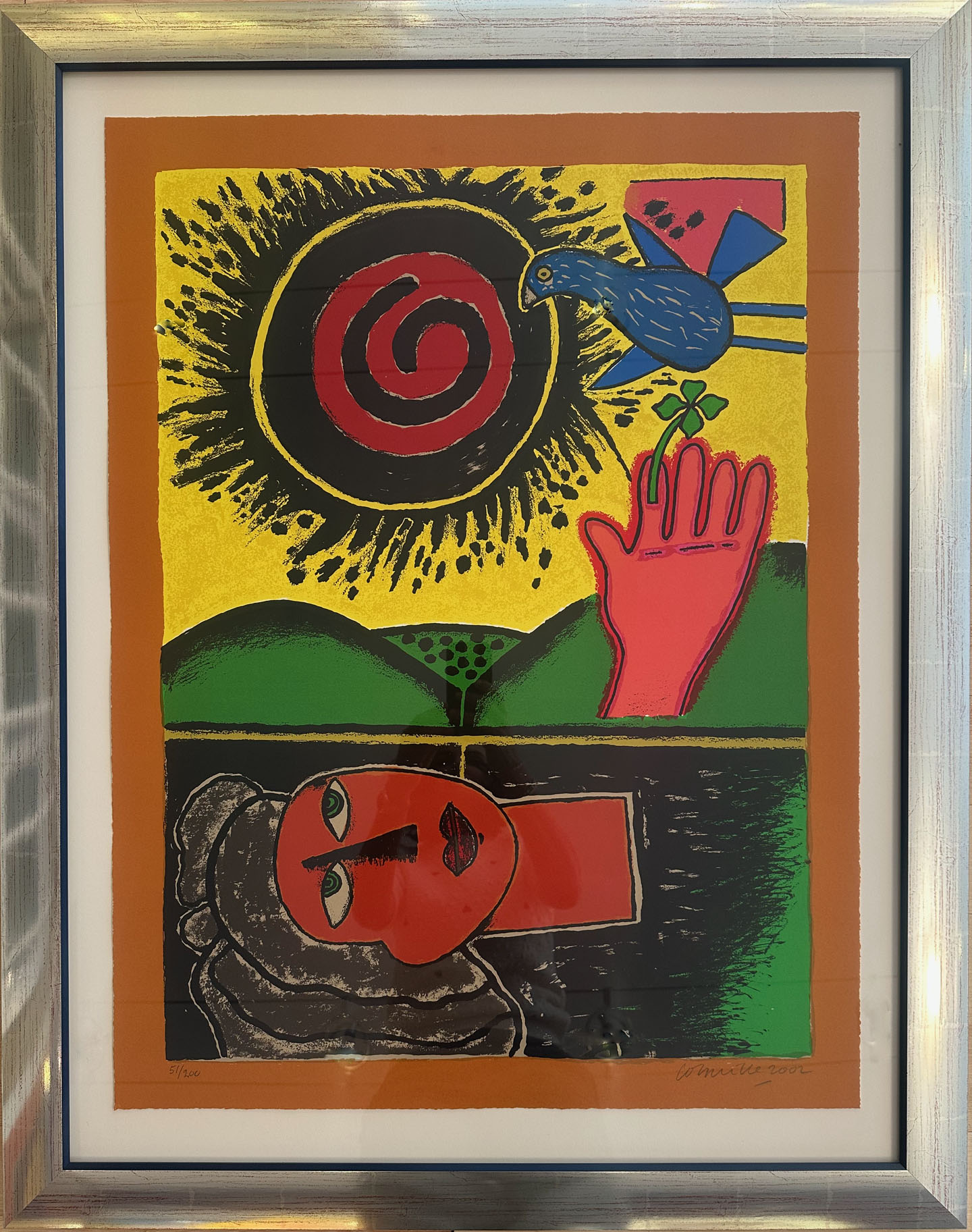 CORNEILLE 'Soleil Cou Coupé II' Zeefdruk 2001 Oplage 200, genummerd en gesigneerd Afmeting papier: 81,5 x 61,5 cm. Afmeting lijst: : 99 x 80 cm. Gepubliceerd door GKM Prijs € 1.100 inclusief lijst